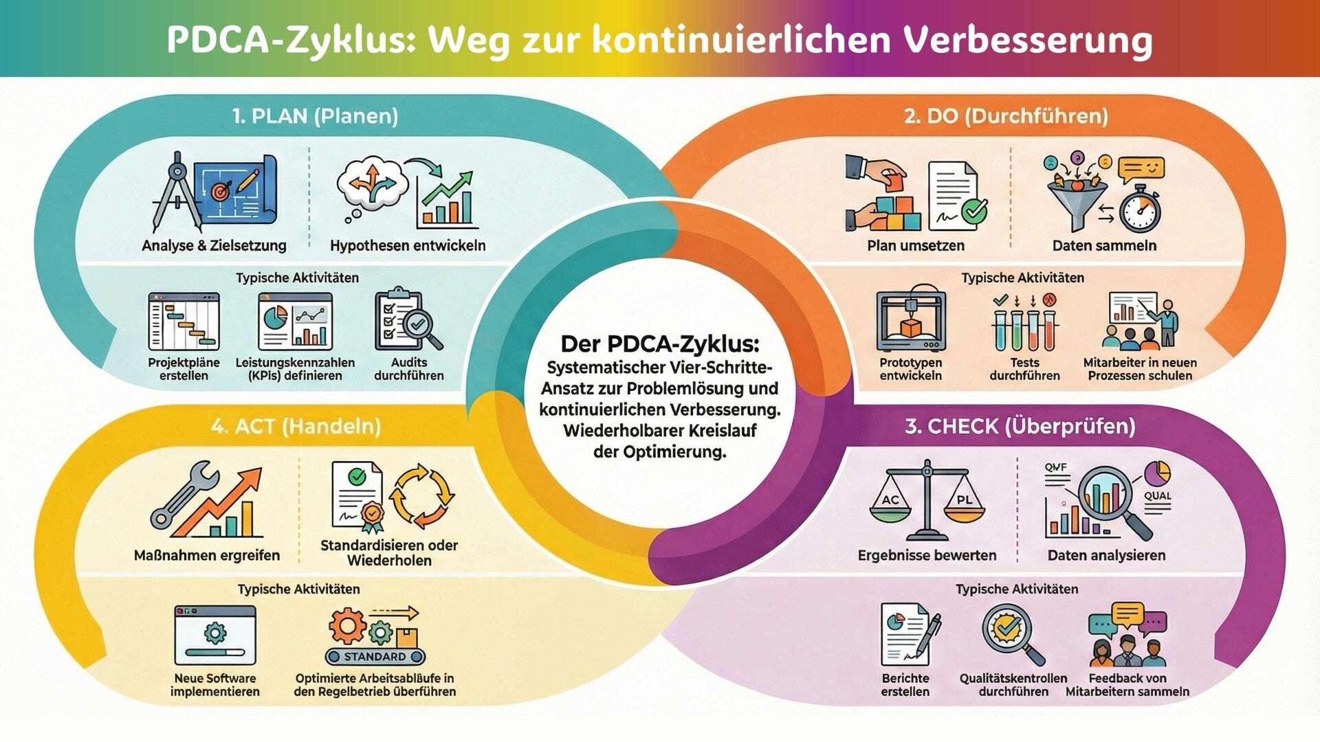 - Act: Standardisierung, Korrekturmaßnahmen, Prozessintegration