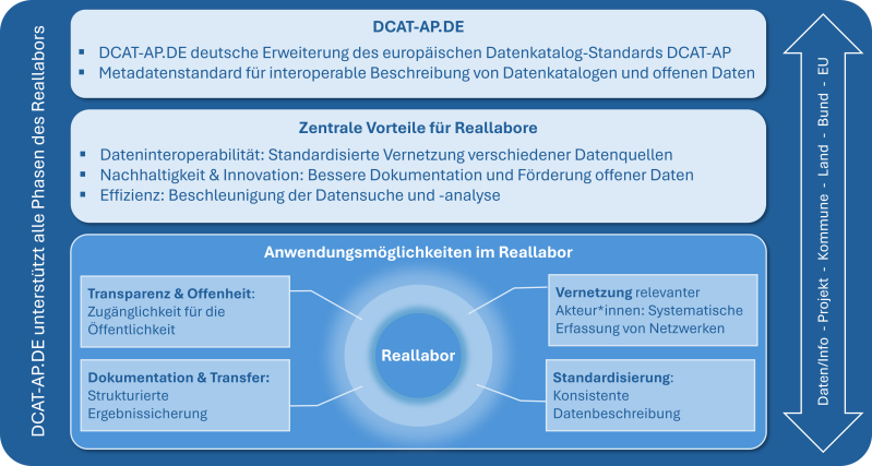 - Ein weiterer Vorteil besteht in der Nachhaltigkeit dieses Standards, der eine bessere Dokumentation und Nachnutzbarkeit der im Reallabor gesammelten oder genutzten Daten ermöglicht. Ein wesentlicher Aspekt ist zudem die Förderung von Innovation durch offene Daten. In diesem Zusammenhang ist DCAT-AP.DE ein wichtiger Baustein, um diese Daten für Dritte zugänglich und nutzbar zu machen.